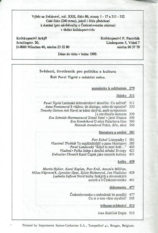 Svědectví, čtvrtletník pro politiku a kulturu. Řídí Pavel Tigrid s redakční radou.